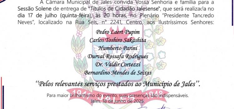A Câmara Municipal de Jales realiza uma Sessão Solene de entrega de “Títulos de Cidadão Jalesense” nesta quinta-feira, dia 17 de julho, a partir das 20h, no Plenário “Presidente Tancredo Neves”, anexo à Casa Legislativa (Rua Seis, 2241, no Centro). O evento é aberto à comunidade.