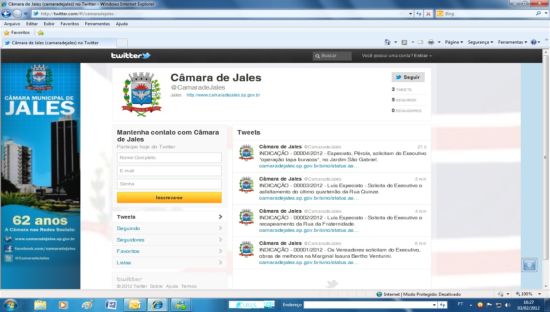 Depois do sucesso no Facebook, a Câmara Municipal de Jales decidiu expandir sua comunicação institucional em redes sociais e lançou, na ultima sexta-feira, dia 03 de fevereiro, sua página oficial no Twitter, serviço de microblogs disponível gratuitamente na internet. O usuário poderá acessar a página através do endereço eletrônico twiter.com/camaradejales ou simplesmente @camaradejales para o envio de mensagens de até 140 caracteres.